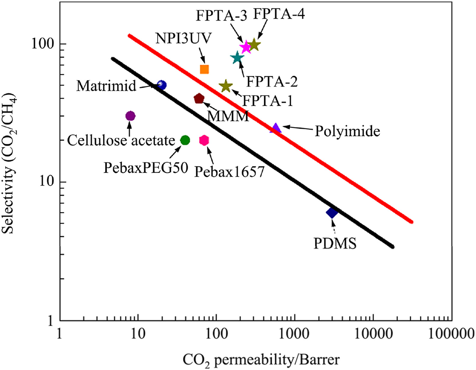 The gas transport properties of both single and mixed gas systems including CH4, CO2, N2, C2H6, and helium (He) were investigated using novel polymer membranes fabricated via solution casting from organic solvents. The fluorinated polytriazole polymers were synthesized through a polycondensation method incorporating hexafluoroisopropylidene the main polymer backbone, with various fluorinated aniline derivatives as side chains. It was observed that the bulky fluorinated aniline derivative groups such as 4-fluoroaniline, 2,5-difluoroaniline, 4-bromo-2,5-difluoroaniline, and 2,3,4,5,6-pentafluoroaniline significantly influenced the gas separation performance of the polymer membranes, particularly in terms of permeability and selectivity. The membranes exhibited excellent mechanical stability across a wide range of pure CO2 feed pressures (100-800 psi, 1 psi = 6.895 kPa) without signs of plasticization, highlighting their robustness for high-pressure applications. Additionally, the polymer synthesis process is reproducible and can be readily scaled, with each material displaying high solubility in organic solvents such as dimethyl acetamide, chloroform, and N-methyl pyrrolidone. Compared to gases such as CH4, N2, and C2H6, the newly developed polymer membranes demonstrated superior permeability for CO2 and He under upstream feed pressures of up to 800 psi. These materials represent a completely novel class of polymer membranes tailored for advanced gas purification technologies. Their enhanced separation performance, particularly for CO2 removal and He recovery from natural gas streams at high processing pressures, positions them as promising candidates for industrial applications in gas purification and separation.